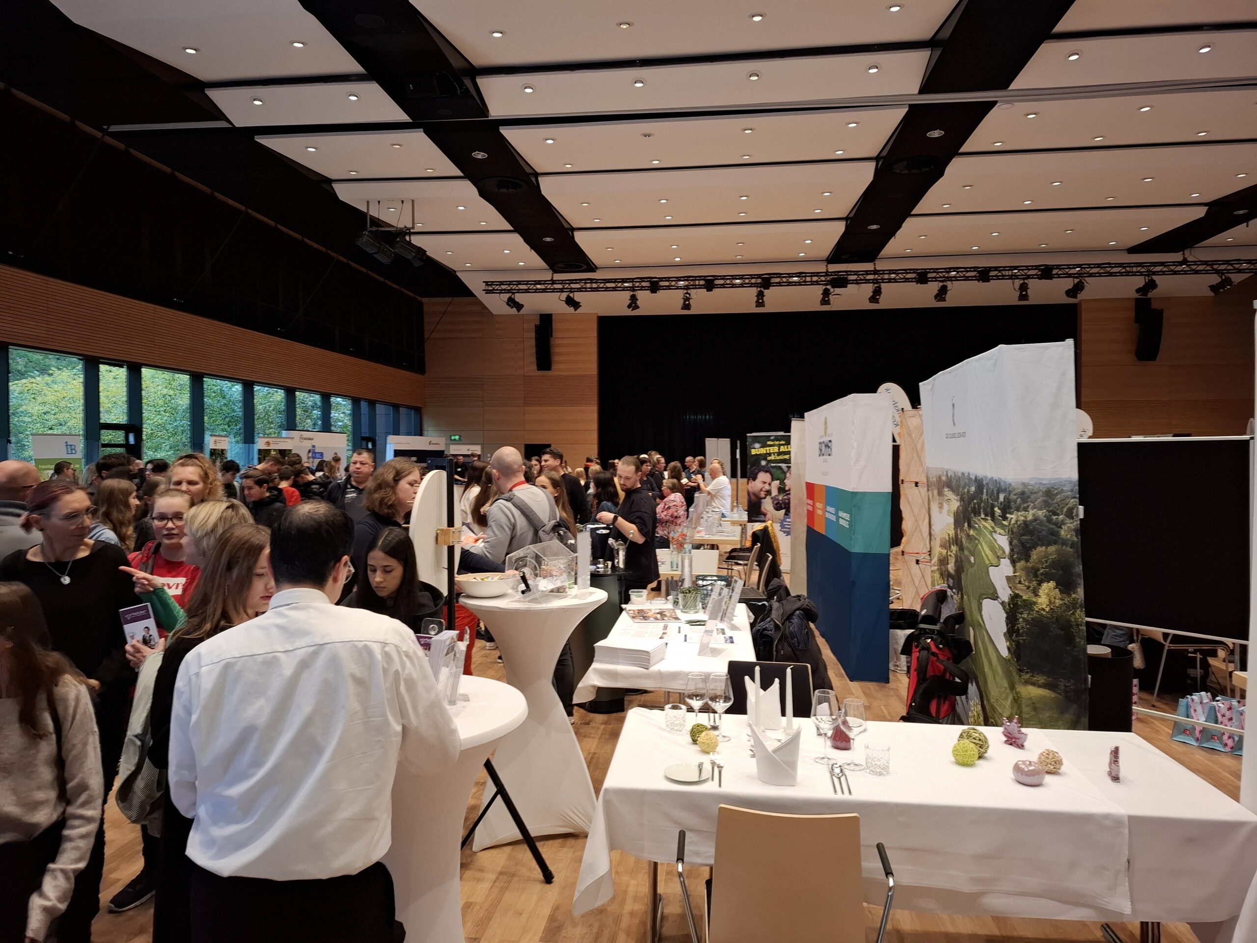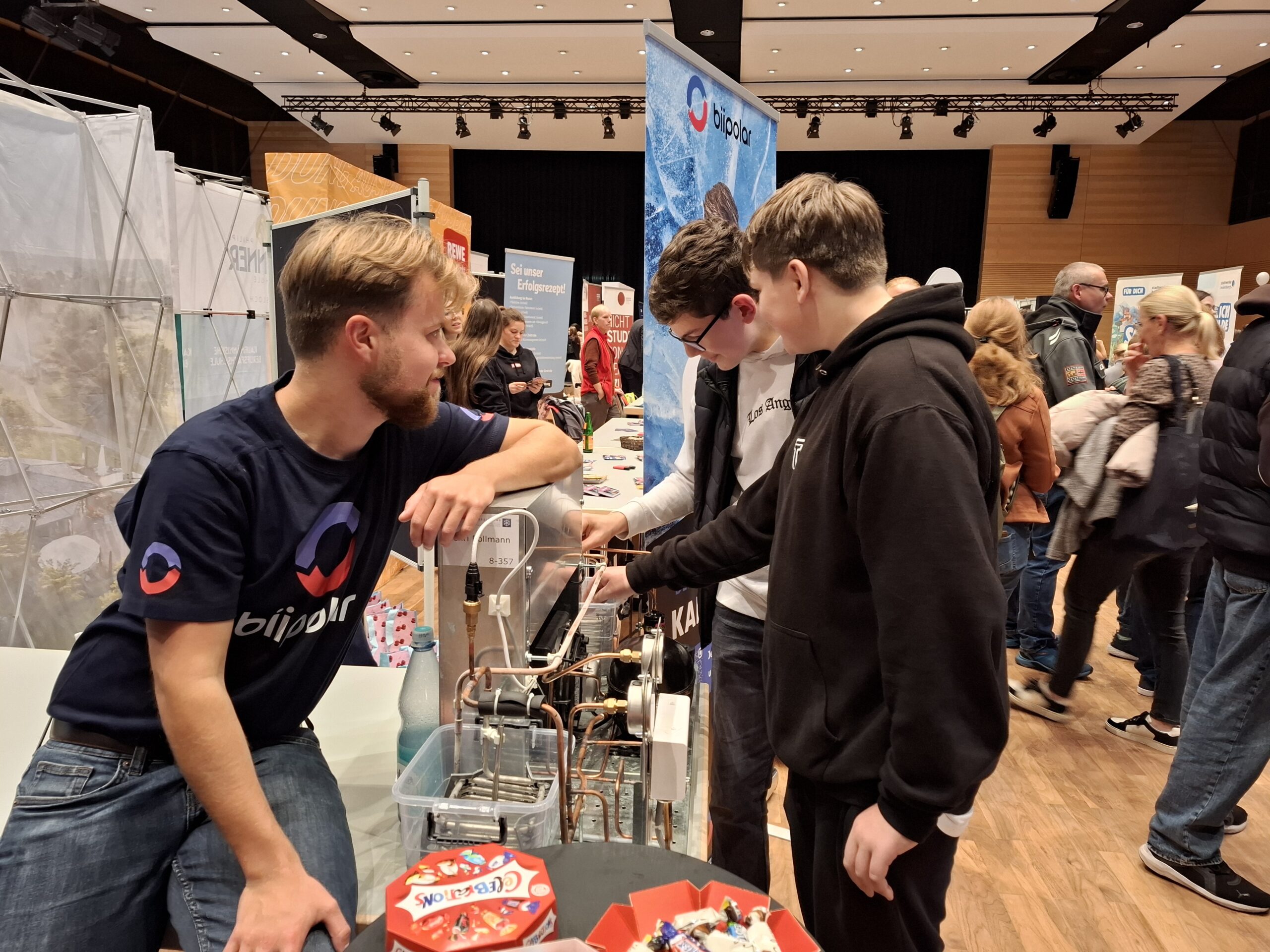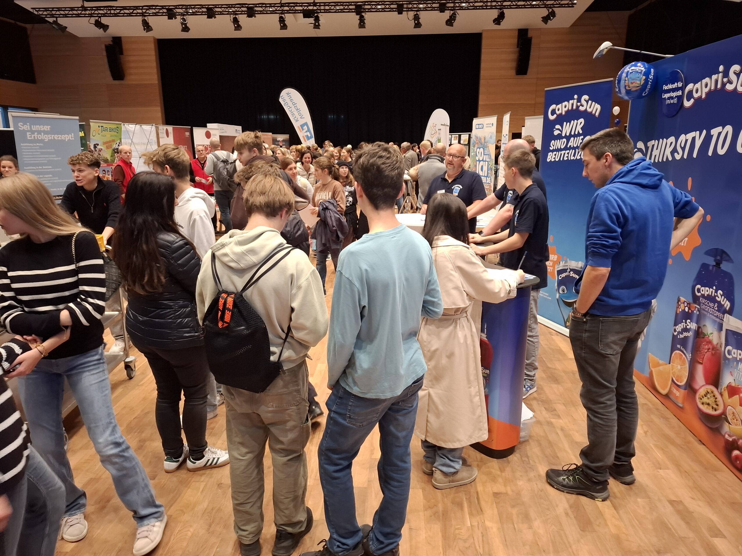 Von 16 bis 18.30 Uhr standen am 22.10.2025 über 50 Unternehmen der Region sowie weiterführende Schulen in der Astoria-Halle als Ansprechpartner zur Verfügung und informierten über Bewerbungsanforderungen und Ausbildungsabläufe. Wie gewohnt waren die einzelnen Stände ideenreich ausgestattet mit allerlei Anschauungsmaterial aus den verschiedensten Berufswelten, so dass die interessierten Besucher allerhand ausprobieren und kennenlernen durften. Nicht wenige Schüler nutzten den Jahrmarkt, um sich einen Praktikumsplatz zu sichern oder Kontaktdaten auszutauschen. Viele hatten auch ihre Eltern mitgebracht, so dass die Halle wieder gut gefüllt war. Organisator Michael Venske, WBS-Lehrer an der THRS, konnte zufrieden sein, denn auch fürs leibliche Wohl war bestens gesorgt: Schülerinnen und Schüler der Klasse 9f verkauften selbergemachte Leckereien, unterstützt von WBS-Lehrer Mathias Schneider.