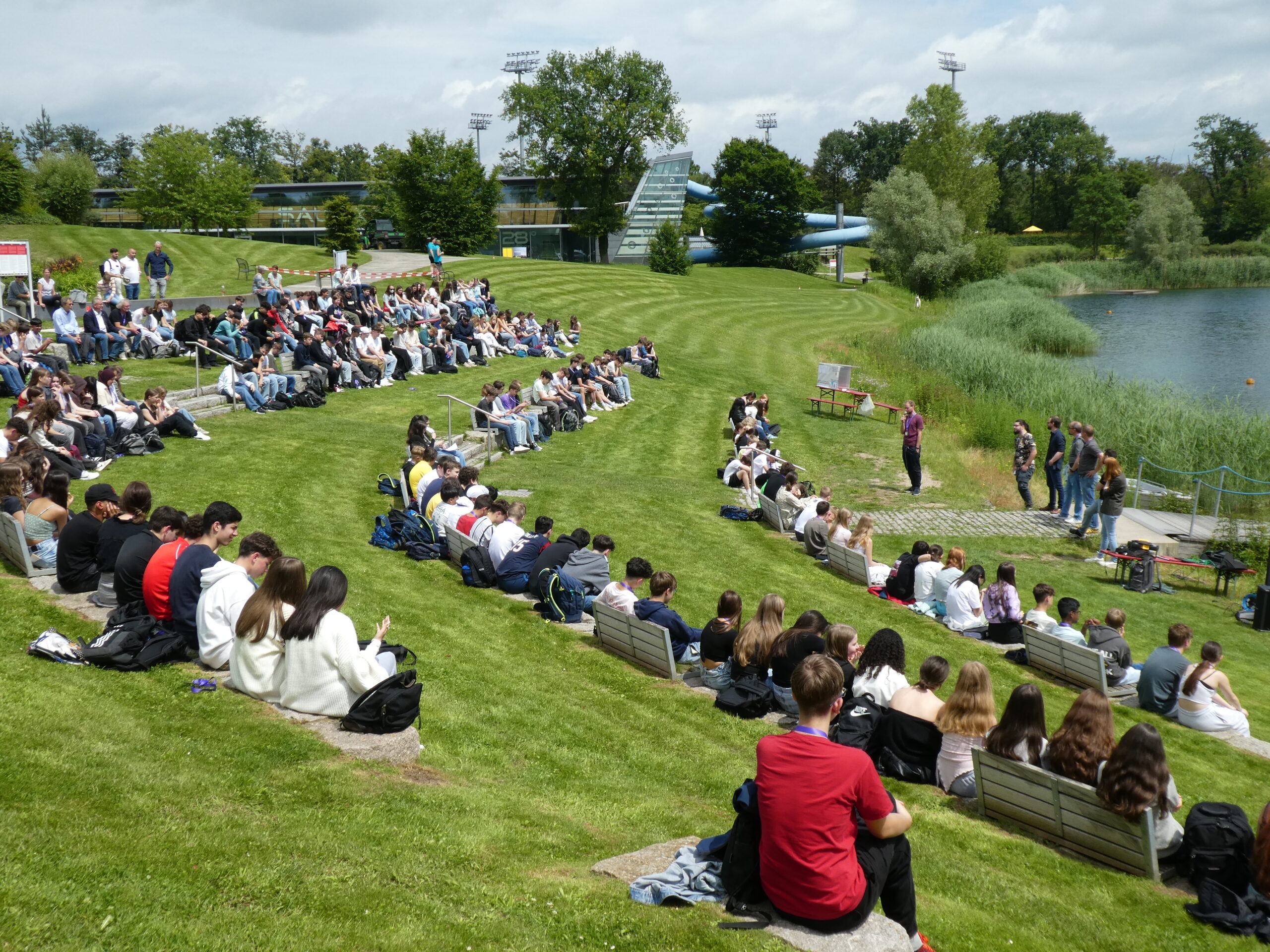 Bei warmen Temperaturen und unter freiem Himmel fanden sich am späten Vormittag des 05.06.2024 die circa 350 Achtklässlerinnen verschiedener Schulen (neben der Theodor-Heuss-Realschule waren auch Schülerinnen und Schüler des Gymnasiums und der Waldschule anwesend) vor der Seebühne des Walldorfer „Aqwa“ ein, um dort an der eineinhalbstündigen Abschlussveranstaltung des sogenannten „Achterrats“ teilzunehmen.