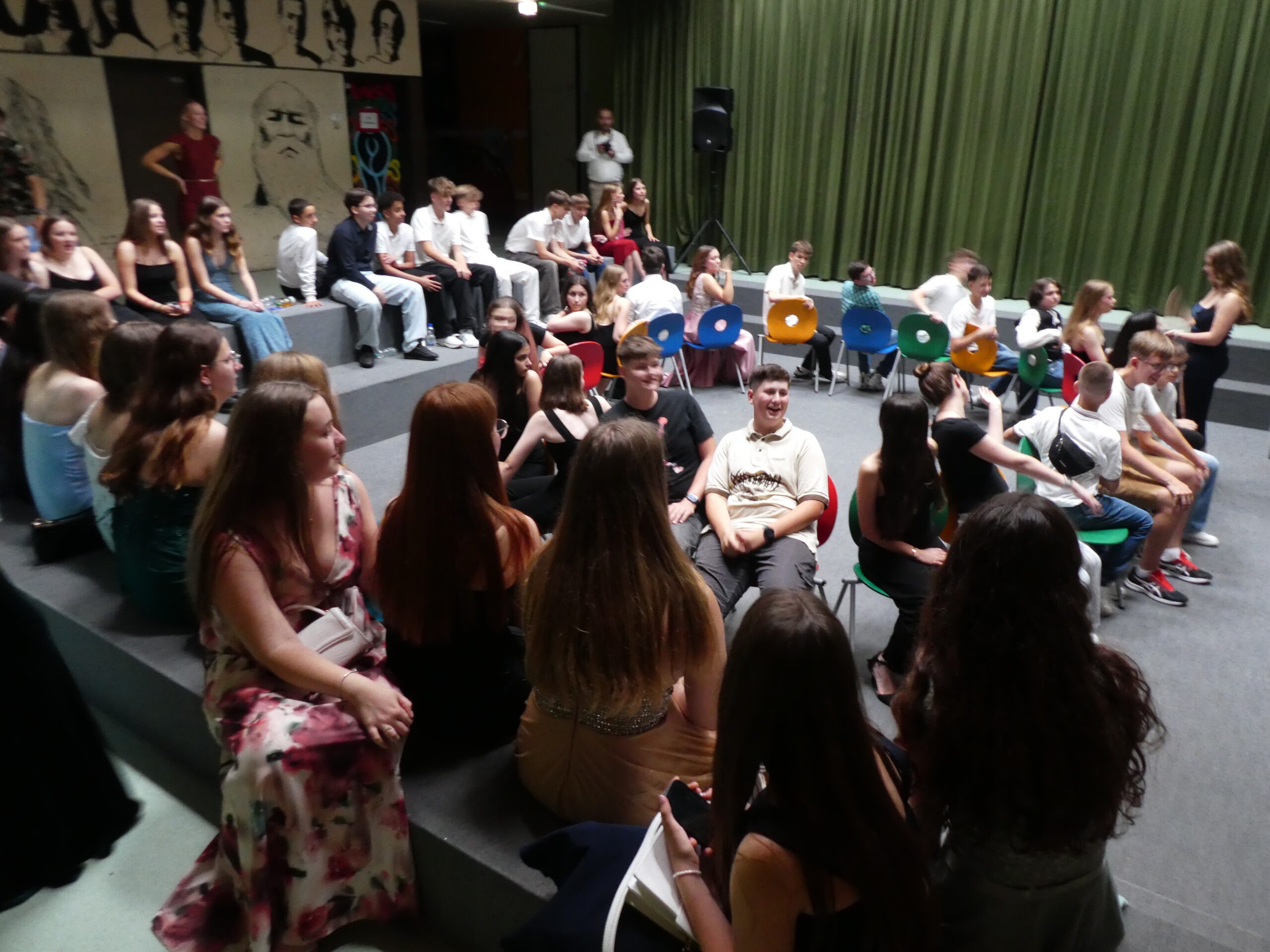 So mancher Lehrer rieb sich erst einmal verwundert die Augen, als er die gut besuchte Aula am Abend des 27.06. 2024 betrat: Waren das wirklich dieselben AchtklässlerInnen, die er am Morgen noch unterrichtet hatte? Weiße Hemden, schwarze Anzüge und edle Ballkleider ließen da Zweifel aufkommen, waren aber natürlich fester Bestandteil und unumgänglicher Dresscode der sogenannten „Prom Night“, einer Schulparty nach amerikanischem Vorbild, bei der festliche Kleidung Pflicht ist.