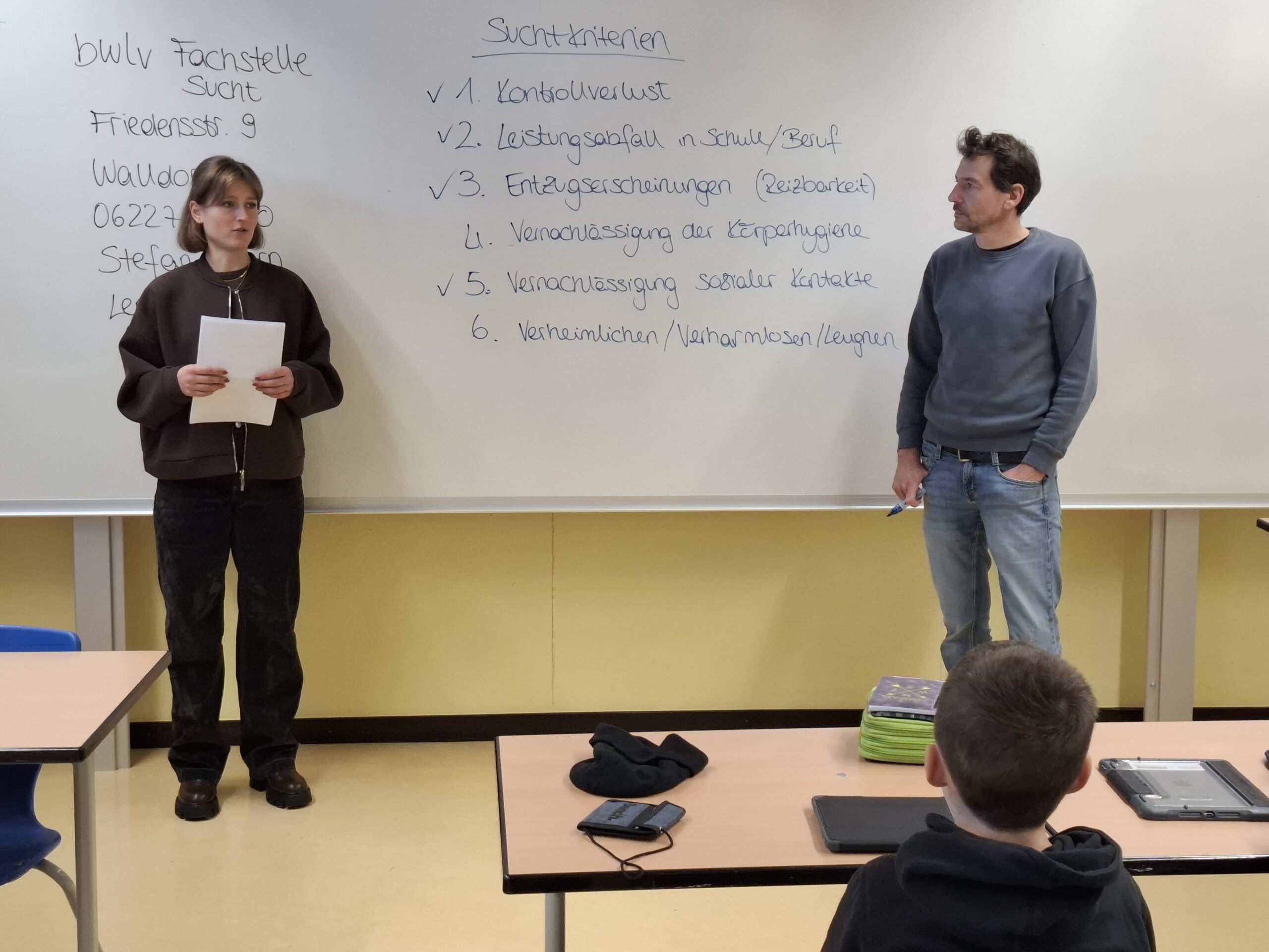 Während das „Lernen Lernen“ sowie der Klimaschutz in der fünften Klasse wichtige Bausteine darstellten, lag der Schwerpunkt bei den Sechstklässlern auf der Medienprävention, durchgeführt von Lena Amelang und Stefan Thorn, zwei Experten der Fachstelle Sucht in Wiesloch. „Wie äußert sich Mediensucht?“ und „Wie kann ich suchtfördernde Mechanismen, die von digitalen Medien ausgehen, erkennen?“ waren dabei wichtige Fragen, denen die Schüler nachgingen. Ein Selbsttest, der ihnen dabei half, ihr eigenes Verhalten einzuschätzen, brachte sicherlich aufschlussreiche Erkenntnisse, die zum Nachdenken anregten.